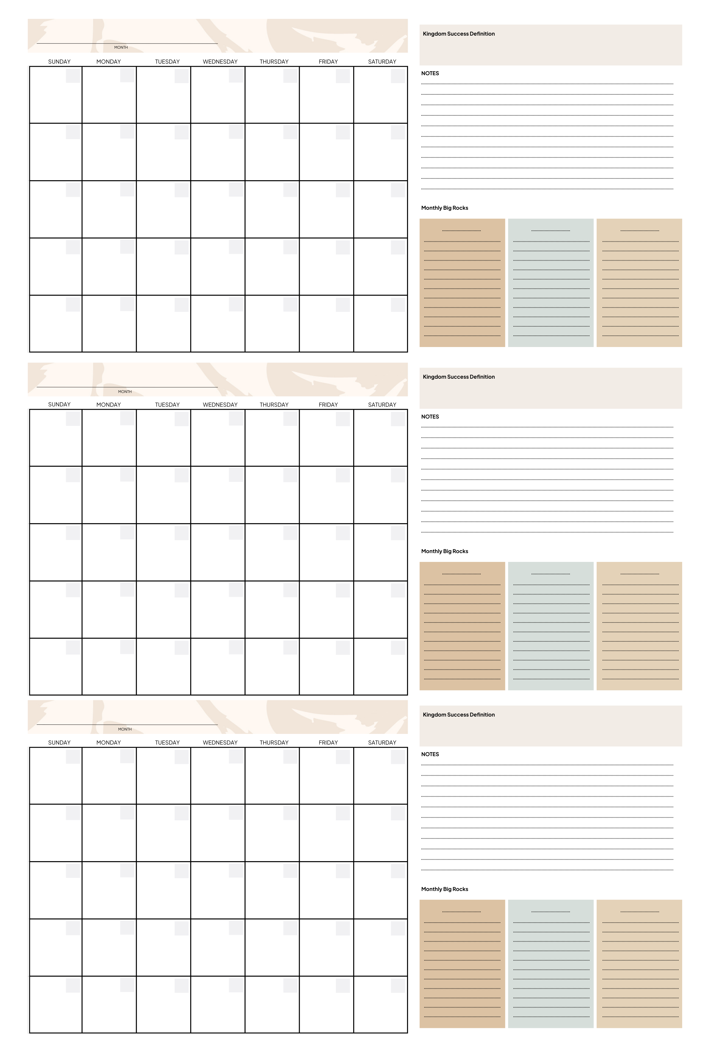 Plan each season with Kingdom clarity. This elegant wall calendar features three spacious monthly grids to track priorities side-by-side, plus a special notes section for your Kingdom Success definition and three big milestones each month.